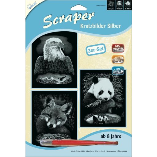 A teljes készlet tartalmaz 3 kaparós képezüstöt (kb. 20 x 25,5 cm), 1 karcoló kést és 1 gyakorlati lapot, amelyek tökéletesek a lelkes kezdéshez.